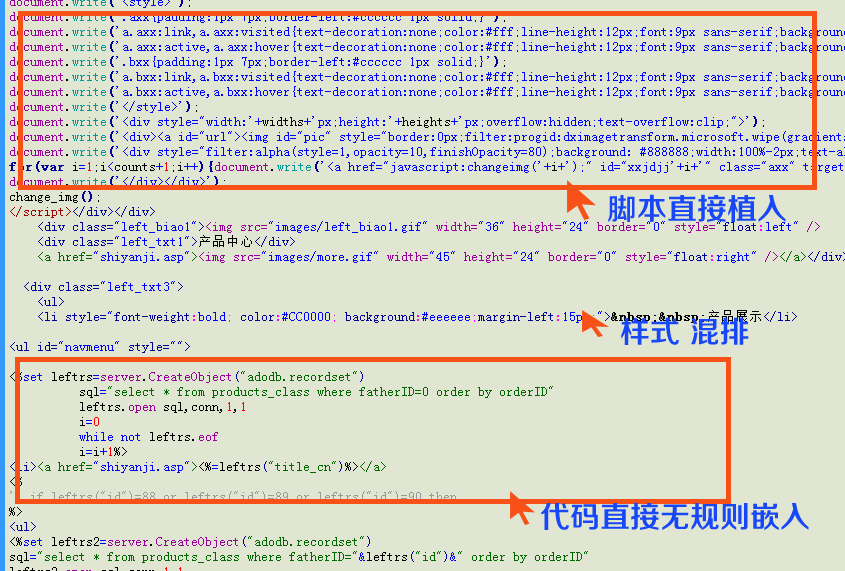 以下代碼截圖是某裝飾公司網(wǎng)站代碼代碼,該裝飾公司在行業(yè)內(nèi)知名度名較高 交換友鏈的時(shí)候發(fā)現(xiàn)他們的網(wǎng)站出現(xiàn)錯(cuò)位,于是老板提出幫忙看一下代碼,處于好心幫著修正了一下部分代碼,不過整個(gè)網(wǎng)站的代碼可以用一個(gè)詞形容 慘不忍睹,上圖有真相